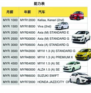 来源:来自于Azizul Azli Ahmad面子书专页 上图显示了我们根据月薪而有能力购买的汽车。
