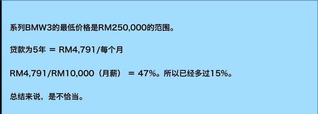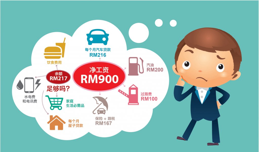 月薪是RM900,扣除生活费后,剩下RM100,这意味着我们只能够买一辆需要每个月偿还RM 50的汽车。换句话说,我们买 不起汽车。