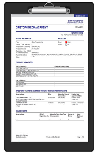 The Entity Profile Report is generated instantly as a PDF document for intuitive reading and easy record-keeping.