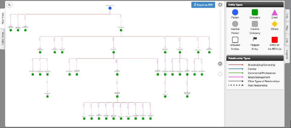 - Beneficial Ownership Map – Map out the ultimate shareholders of a company through intermediate connections and interests.