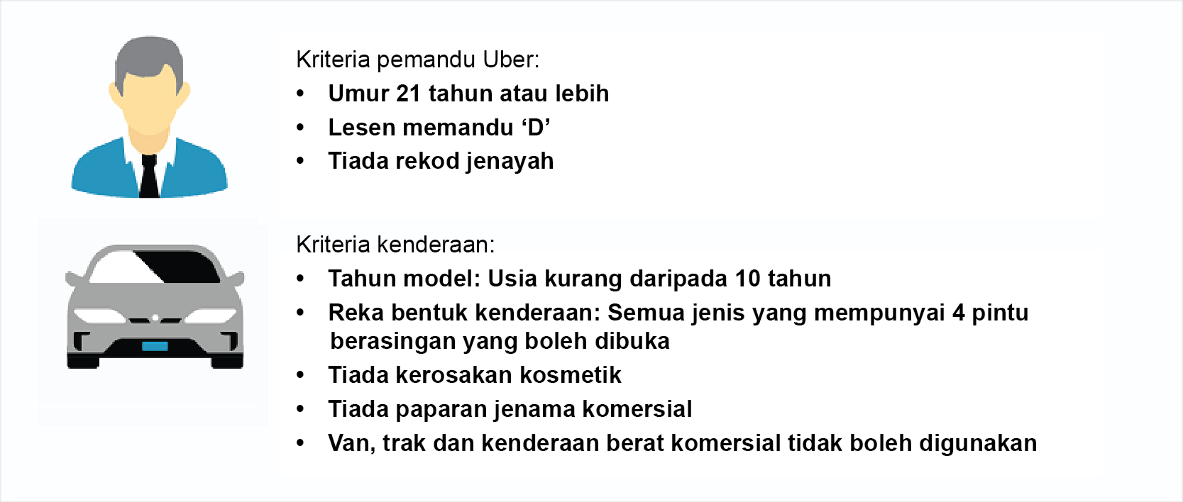 Walau bagaimanapun, beberapa keperluan asas perlu dipenuhi untuk menjadi Uber Driver-Partner. Langkah pertama, tentu saja, adalah untuk mempunyai kereta. Bukan sekadar kereta sahaja, tetapi kereta yang memenuhi piawaian yang betul. Uber Driver-Partner sedia ada yang mempunyai kenderaan penuaan juga tertakluk kepada syarat ini.
